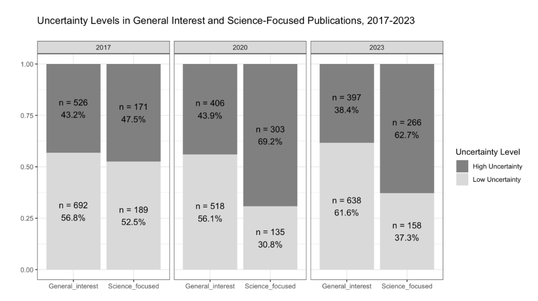 În textele de interes general, care nu se ocupă cu probleme științifice, gradul de incertitudine a rămas aproximativ constant. Însă în comunicarea publică pe probleme de sănătate și știință, anul 2020 a fost unul de cotitură. Procentul de texte care conțin indicatori de incertitudine a crescut de la 47,5% la 69,2% (pe mostrele analizate, de cîteva sute de publicații), iar după pandemie, în 2023, nivelul s-a păstrat la o valoare similară, de 62,7%.