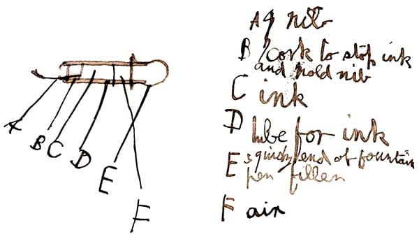 Apoi, în 1954, logicianul îi scrie mamei, din America, bucuros că i-a putut el trimite un stilou: „Este un model nou, care trage cerneala prin vîrf”. Coroborarea istorică sugerează că ar fi putut fi modelul Sheaffer Snorkel, produs de americani între 1952 și 1959, căruia i se coboară o tijă prin ansamblul peniței, cu care trage cerneala în rezervor.